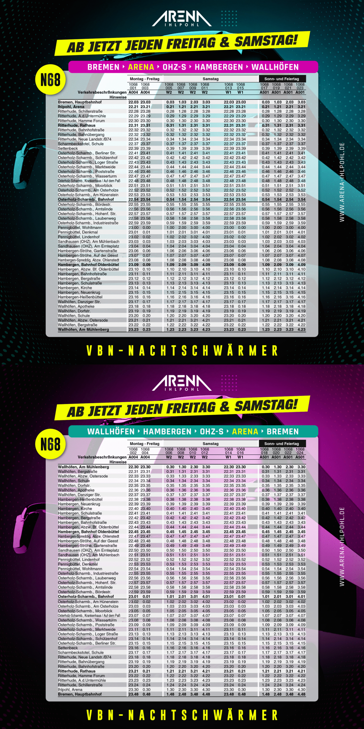 Ab sofort bringt dich der N68 Nightliner jeden Freitag & Samstag bequem und sicher zur ARENA Ihlpohl und natürlich auch wieder zurück nach Hause.