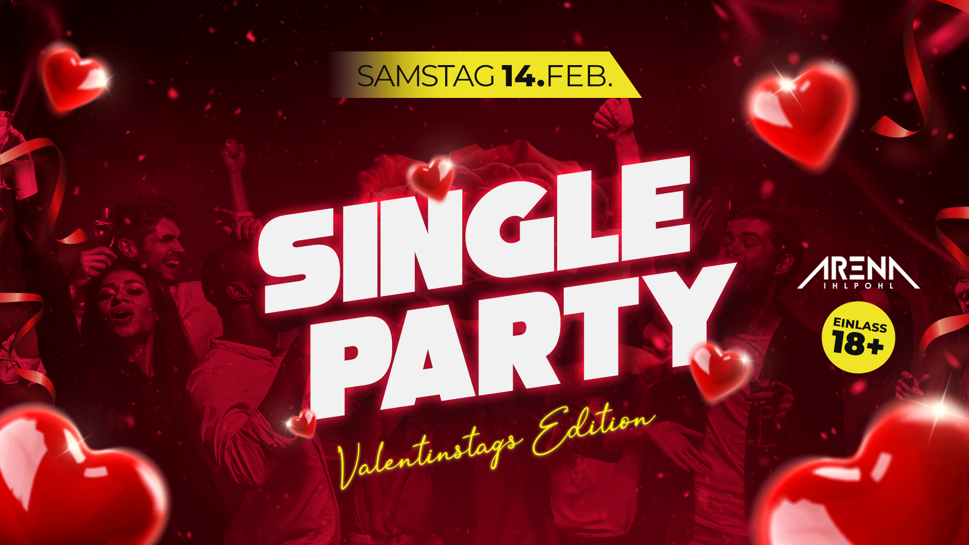- ❤️🔥 DIE MEGA SINGLE PARTY 🔥❤️ ★★ VALENTINSTAGS EDITION ★★ 🕚 Früh kommen lohnt sich! ❣️ ALLE LADIES ERHALTEN BIS 23:30 UHR: 🍸 GRATIS EINTRIIT + 1 FREIGETRÄNK NACH WAHL 🍸 ➖➖➖➖➖➖➖➖➖➖➖➖➖➖➖ 📅 Samstag, 14.02.2026 🕘 Start 22:30 Uhr 📍 Discothek Arena Ihlpohl 🔥 3 Areas: Main Arena | Black Arena | Party Arena ➖➖➖➖➖➖➖➖➖➖➖➖➖➖➖ ❤️🔥 SINGLE PARTY – VALENTINSTAGS EDITION 🔥❤️ Valentinstag mal anders. Am Samstag, den 14. Februar, wird die ARENA IHLPOHL zum Treffpunkt für alle, die Single sind, feiern wollen oder einfach offen für Neues sind. Keine Paare, kein Kitsch – sondern Tanzen, Flirten und eine lange Nacht auf der Tanzfläche. Ob du jemanden kennenlernst oder einfach nur feierst, bleibt ganz dir überlassen. Vergiss Candle-Light-Dinner und Rosen – wir feiern Valentinstag auf unsere Art 😈🔥 Laut. Wild. Unvergesslich. ❣️ Single sein war noch nie so sexy! GRÜN, ROTES oder doch lieber ein GELBES Neon-Bändchen? Auf den ersten Blick nur ein cooles Schmuckstück am Handgelenk des anderen... Doch auf dieser Party geht es darum, auf den ersten Blick zu erkennen, wer Single, vergeben oder für absolut alles zu haben ist ! 𝐖𝐈𝐄 𝐖𝐄𝐈𝐓 𝐆𝐄𝐇𝐒𝐓 𝐃𝐔 𝐈𝐍 𝐃𝐈𝐄𝐒𝐄𝐑 𝐍𝐀𝐂𝐇𝐓 ⁉️⁉️ 💚 𝐉𝐀! Ich bin zu allem bereit! 💛 𝐕𝐈𝐄𝐋𝐋𝐄𝐈𝐂𝐇𝐓! Ich lasse es auf einen Versuch ankommen! ❤️ 𝐍𝐄𝐈𝐍! Ich will nicht flirten! ➖➖➖➖➖➖➖➖➖➖➖➖➖➖➖ 🔥 MAIN AREA Charts · House · Electro · 90er & 2000er Von aktuellen Hits bis zu den größten Klassikern – alles, was die Tanzfläche zum Beben bringt 👉 Mitsingen. Abgehen. Die Nacht fühlen. 🎧 BLACK AREA Black Music · Deutschrap · Amapiano Treibende Grooves, fette Bässe & smoother Vibe Von freshen Tracks bis zu zeitlosen Classics 👉 Deep Vibes & Late-Night-Energy garantiert 💃 PARTY AREA Discofox & Schlager Feierlaune pur, bekannte Hits & volle Tanzfläche 👉 Stillstehen ist keine Option ➖➖➖➖➖➖➖➖➖➖➖➖➖➖➖ ⭐ VIP-Lounge buchen & exklusiv feiern! ⭐ Exklusive Lounges mit Tischbedienung, Candys & Snacks. ⚠️ Begrenzte Kapazität – jetzt sichern! 👉 Direkt in der Veranstaltung auf www.arena-ihlpohl.de ➖➖➖➖➖➖➖➖➖➖➖➖➖➖➖ ℹ️ Eintritts-Infos 🔹 Kein Mindestverzehr 🔹 Einlass 18+ 🔹 Ausweispflicht
